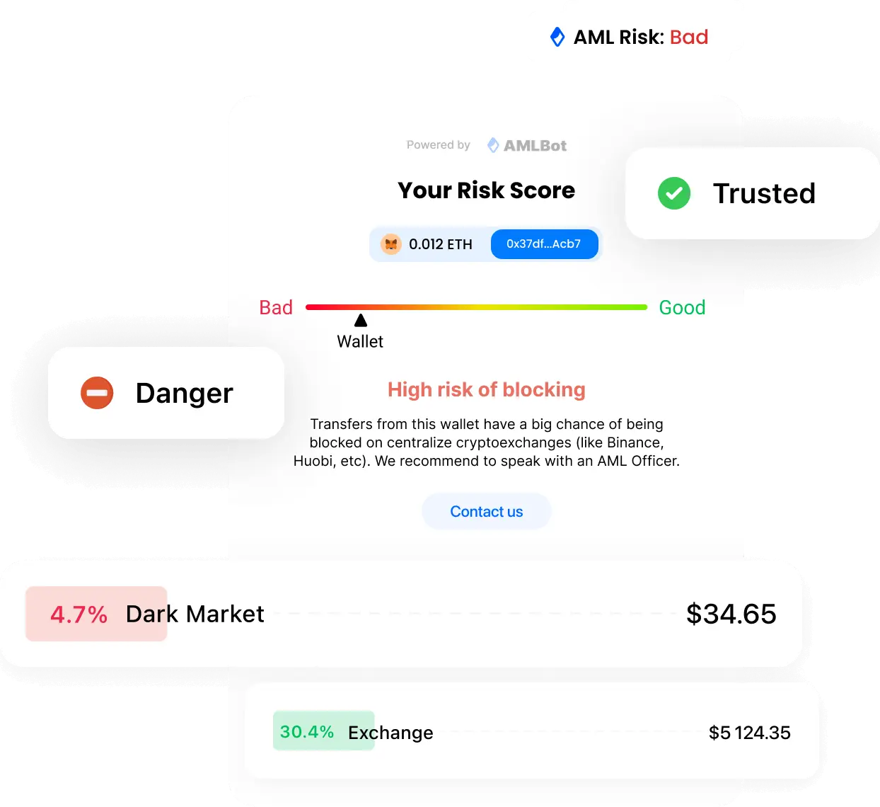 We screen crypto wallets and transactions to identify the source of funds and provide you with a detailed report. Determine the risk score of any wallet to avoid problems with regulatory authorities and to protect yourself from illicit funds.